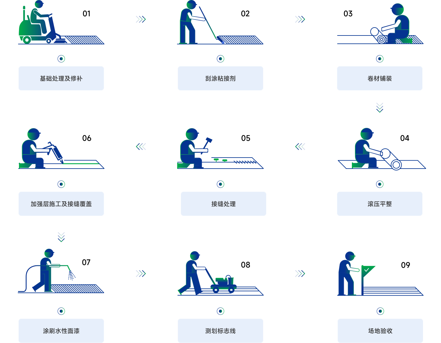 防滑層:場地現(xiàn)場現(xiàn)澆,厚度一般為3mm,提供可靠的摩擦力,并有效地處理預(yù)制型彈性層鋪設(shè)過程中產(chǎn)生的接縫。